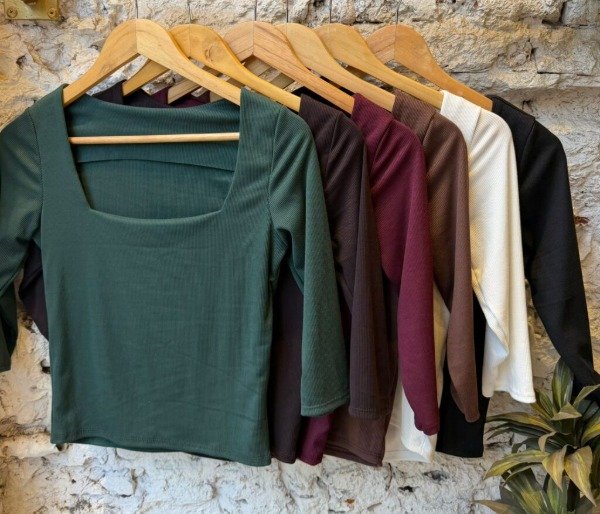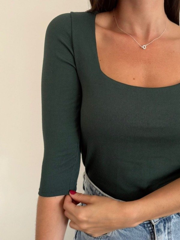 Remera con Mangas 3/4, cuenta con un escote cuadrado y la espalda es cerrada.